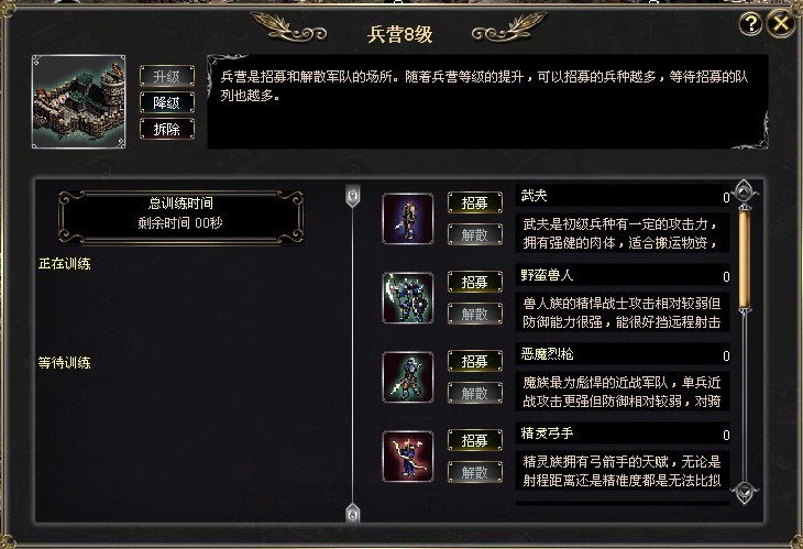 是用于招聘与解聘军队的场所,提升步兵营的等级,可以训练更高级的兵种。