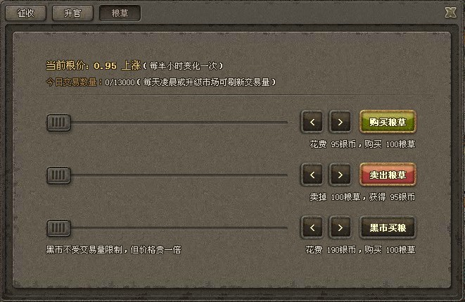 囤积粮草:从15级开始您在战斗中就要消耗士兵了,士兵需要用粮草来招募。粮草的储备非常关键,获得粮草的最简单方法是在界面的右下角点击“农田”按钮,占领农田。农田产量有大有小,您也可以抢夺其他玩家的农田。另外,在城池的市场中,您也可以买卖粮草。粮草的价格每小时进行变化,尽量选择在低价时候买进。