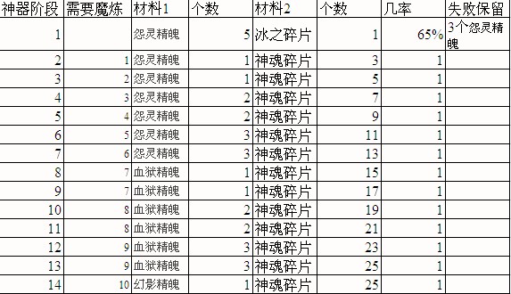 对应等级的神器【天魔神兵】=神魂碎片+对应等级的神器材料