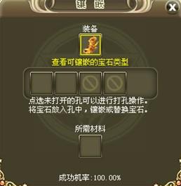 通过镶嵌不同类型的宝石可以给装备带来更强大的属性,而要镶嵌宝石首先必须在装备上带上有可以镶嵌的孔,可以通过打孔道具给装备增加孔数的数量。不同的装备最大孔的数量不同,而且不同装备可以镶嵌的宝石种类也不同。