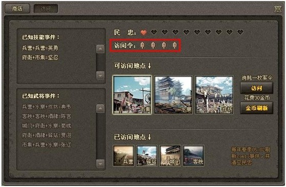 访问——主营访问提供了主要的银币来源,游戏中每天有5次免费的访问机会,玩家还能通过访问来获得军令、金币、隐藏技能、隐藏武将。如此给力的系统,去试试运气又何妨呢?