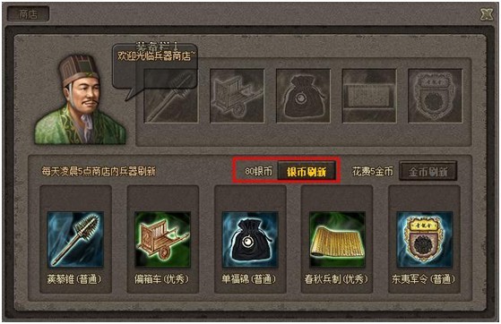 刷新兵器——刷新兵器每天的前几次价格很便宜,如果运气好刷出品质上层的兵器,那么你当天推图就爽歪歪了。