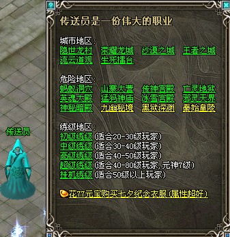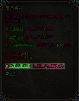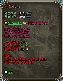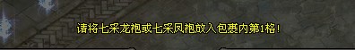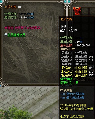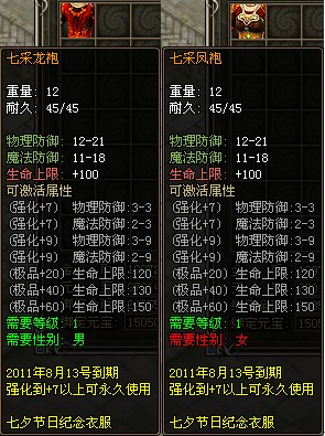 每位玩家都可在各大城传送员处花77元宝购买1件七采龙袍(七采凤袍),此衣服8月12日到期,从8月13日开始,只要穿戴此衣服就会被系统回收掉,如果将此衣服强化到+7及+7以上则不回收,此衣服还可以在熔炉中进行祈灵,最高可祈灵到极品+64(极品属性全部加一起)点,极品属性越高还会相应激活衣服上的额外属性!