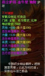 地阶恋尘护符:分为牛郎星、织女星、金牛星三种,其中特色属性+120(满),其余三属性+100(满),除2固定总生命值+1%紫属性外,另附2个紫色1%随机属性