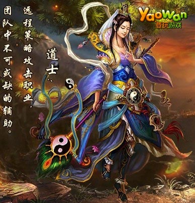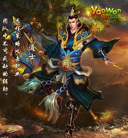 擅长给队友补给并精通秘术,以幡作为武器,装备多为布衣并且用料较少,带有某种异域的神秘感。他们拥有强大的法力,不但能给友方提供各种正面补给并对敌方实施各种负面影响,还能召唤一些生物助战,一个好的道士是一个团队必不可少的重要力量。