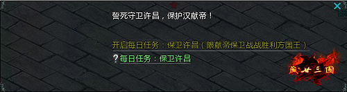 发布后,任务怪会刷新在许昌南门外(346,372)完成后获得海量经验(献帝保卫战胜利国为1.5倍)和高级星石(随机3-7个)的奖励。