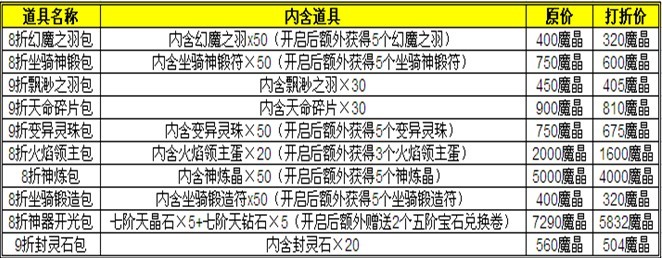 活动期间,在活动期间,商城将推出多种商城道具折扣礼包,限时活动,逾期不候.