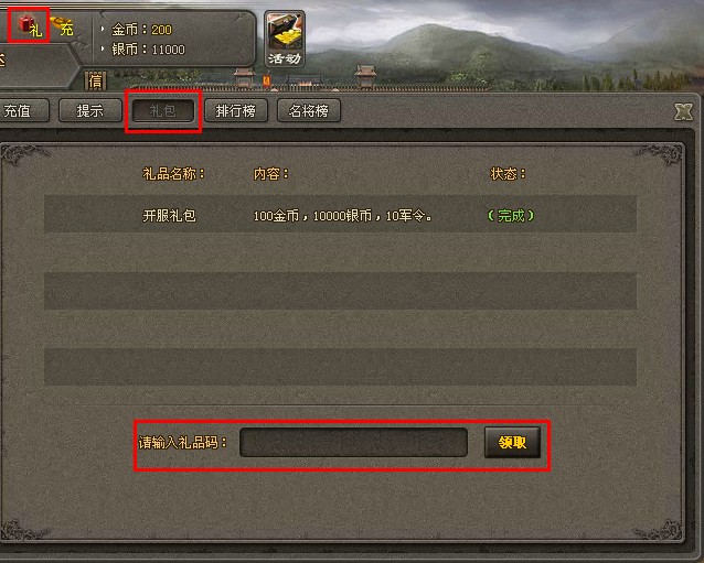 进入游戏,点击左侧“礼”图标后,如下图所示。再输入卡号领取即可使用。(可与新手卡同时使用)