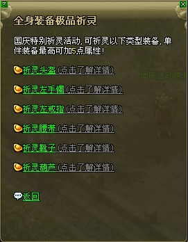 1、国庆特别祈灵活动,可祈灵头盔、手镯、戒指、腰带、鞋子、勋章哦,每件装备最高可以加到5点极品属性哦。