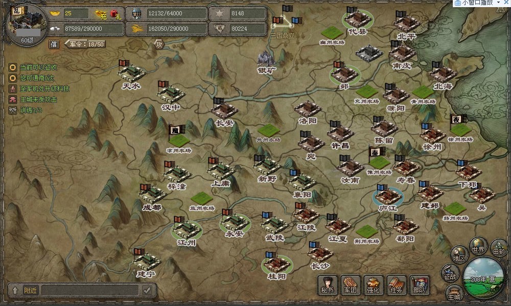 地区场景:地区界面中分布着与您处在同一等级范围的玩家城池,和银矿。您可以对其他玩家进行征服,使其成为您的附属。还可以占领银矿,获得更多收益。