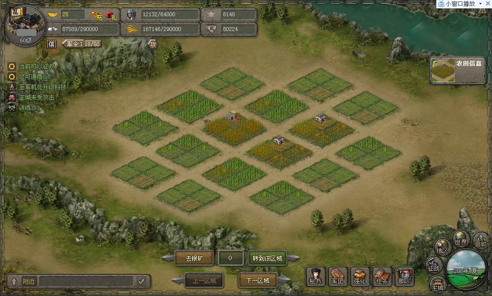 农田场景:农田场景中分布着产量不同的农田,供玩家占领,占领时间为四小时。粮草是征战的关键,赶快去抢夺高产农田吧。