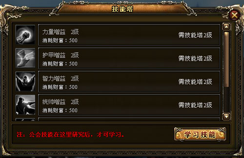 技能塔:在这里玩家可以学会一些公会能独有的技能,让你能力更上一层楼。