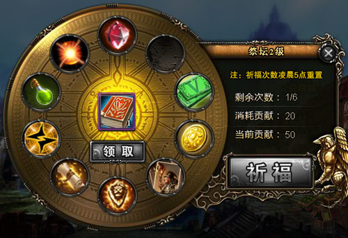 祭坛:在祭坛玩家可以使用贡献值来祈福,每次祈福消耗20点贡献值,可获得礼金、宝石、战魂等奖励,祭坛等级影响公会成员每天祈福次数。