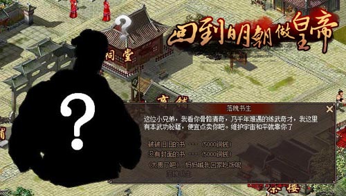 工欲善其事,必先利其器。如果顺利招募了一名武力初始值牛叉的高手,那么就要开始打造他成为能力压群雄的NO.1护卫了。首先是技能,力气再大不懂武功也顶不了鸟用。快去刷街刷出落魄书生吧,他手上可有众多武林秘笈,不过前提是要答对问题哦。当然,你也可以花费铜钱在秘笈售卖官那里购买技能。