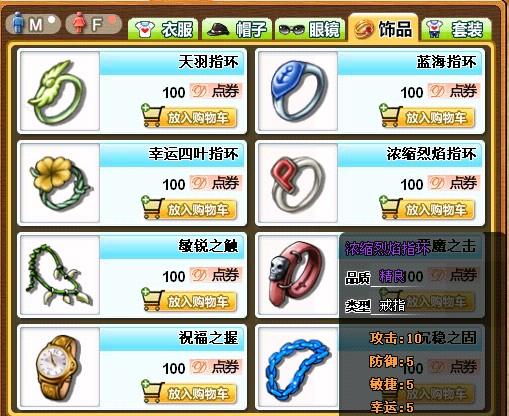 戒指是我们生活中最受欢迎的饰品之一,如同灿烂之光在我们的手指上散发出无穷的魅力。而在弹弹堂的GG和MM的手中,戒指不再只是普通的装饰物,它具有攻击、防御、敏捷、幸运四大神功。在商城中出售的四大指环里,攻击最强的就是*浓缩烈焰指环*了,其余三种则在防御、敏捷和幸运上各显威力。