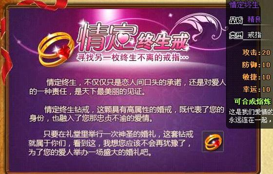 除了以上四枚戒指,还有一枚特殊且具有重要意义的戒指,那就是婚戒了。婚戒当然是只有已婚者才可以拥有,是玩家们的结婚见证,其意义不仅在于永恒爱情的象征,更重要的是其具有的神功相对其它普通戒指而言是最强大的。在普通情况下,婚戒的攻击、防御、敏捷及幸运是普通戒指的两倍。