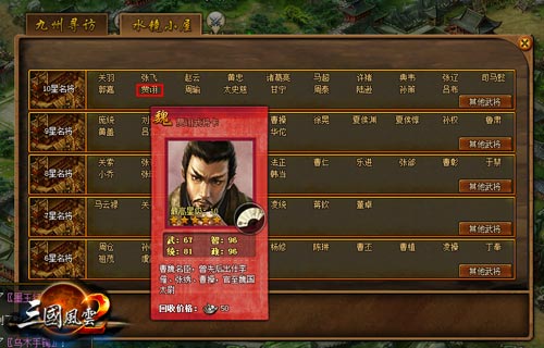 泱泱中华,要到何处寻得良将。幸而要玩《三国风云2》中有一位水镜先生,由于他的才华在东汉末年一直始终未得施展,医生湮没不彰,遂到游戏中帮助玩家。在水镜先生的水镜小屋中,三国各大武将的详细资料都被记载在案,其中的招募银两,武将三围以及所处地点,都是玩家寻访的重要依据。