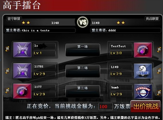 一直以来大家对盟赛方式的支持热度都是有增无减,范特西游戏也是在不断的进步,盟赛经过两个多月的测试,证实这是我们一个很好的交流平台,提高玩家的互动。同时也收集了众多玩家网友的宝贵意见。为此这次版本更新将盟赛改为联盟擂台赛,各盟竞价派出3队实行轮流战。(就像打街霸一样是不是很过瘾呢,还有官方赞助经费哦!)