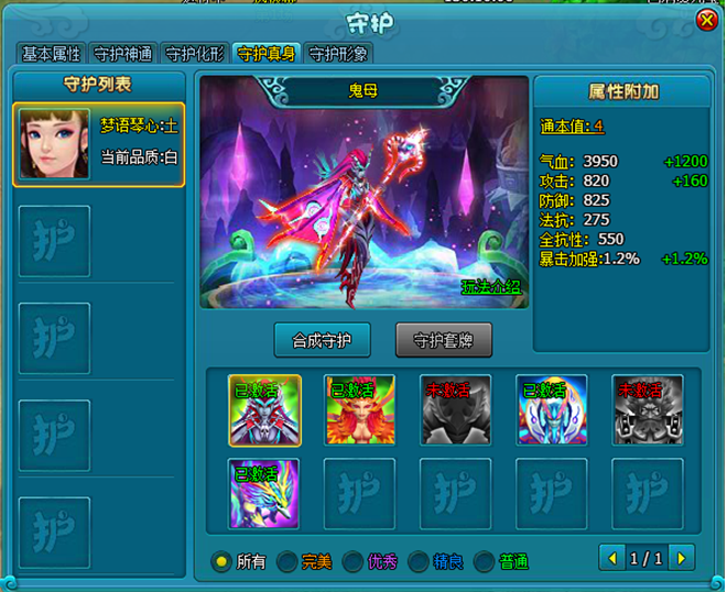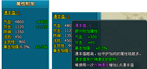 4.守护增加通本值,使用六神通本(活动获得)可提升通本值,获得额外的属性加成,通本值越高,给守护加成的属性就越多。