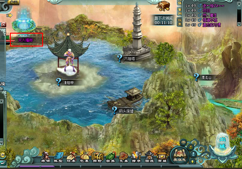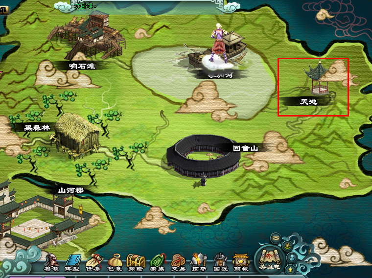 位于山河郡外的天池,路线:山河郡-天池—天人福邸。
