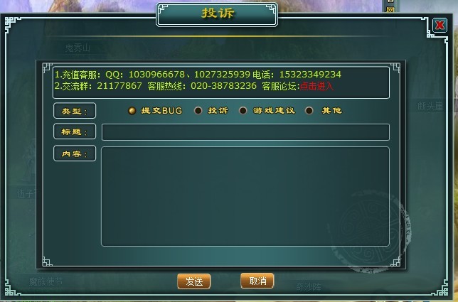 在文字输入框的右边有“联系GM”按钮,点击开启投诉窗口。