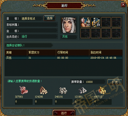 4. 输入所需要携带的粮食,点击“运行“,英雄会直接出现在此名城附近: