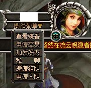 操作菜单下有:查看装备、申请交易、加为好友、私聊、邀请组队、申请入队