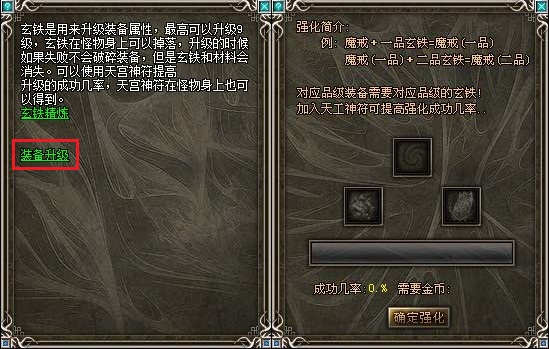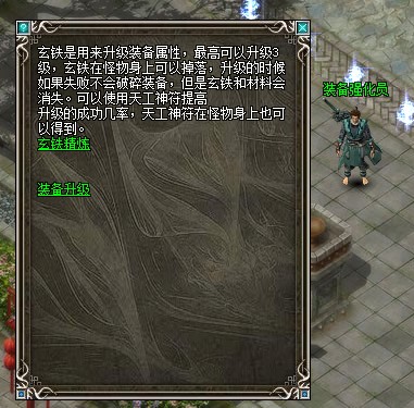 玄铁是用来升级装备属性,最高可以升级5级,玄铁在怪物身上可以掉落,升级的时候如果失败不会破碎装备,但是玄铁和材料会消失,可以使用天工神符提高升级的成功几率,天工神符在怪物身上也可以得到。