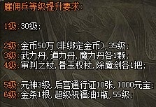 雇佣兵系统有荣誉的封号显示,总的有六级。每一级雇佣兵的提升都需要达到相应的条件,各级提升所需条件如下: