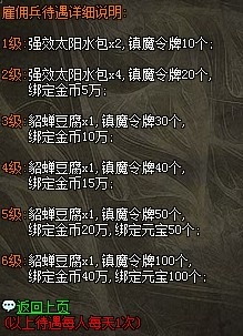 雇佣兵系统是一个荣誉系统,成为雇佣兵可以获取相应的待遇,待遇为每天可以根据你的级别不同领取不同数量的药包和豆腐。还可以进入雇佣兵战场练级!
