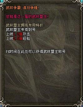 如果在15点之前还未选出武林盟主则争霸大厅内所有人都算挑战失败!选出武林盟主就一个条件,15点之前争霸大厅内只剩1人,此人则是武林盟主!