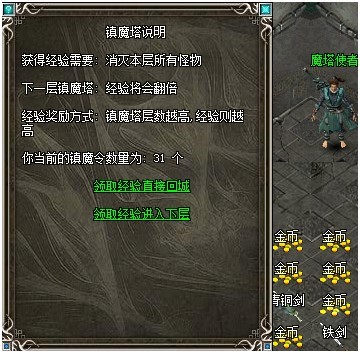 每通关一层可以到魔塔使者处提交镇魔灵进入下一层