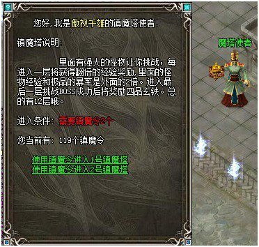 镇魔塔系统是一个新开挑战系统,同时这也是一个打宝练级的好地方!魔塔共有12层,每一层都需要一定数量的镇魔令进入,通关时间限制为3分钟,超过3分钟会被自动传送回城!每通关一层都可以获得大量经验奖励,而随着层数的增加,经验奖励也会翻倍的增加哦!在魔塔里面打怪也会掉落大量装备!成功通关12层更能获得2个四品玄铁石!魔塔使者NPC:龙城(87,80)