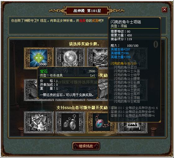 2、战神殿内将会掉落经验球、紫装、各类收费道具,以及数量不等的宝石(宝石可在界面下方点击兑换,换取点券,换取比例为1:1)。挑战的层数越高,掉落的物品越好