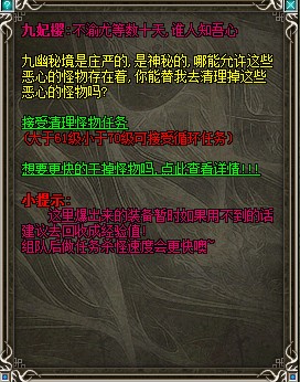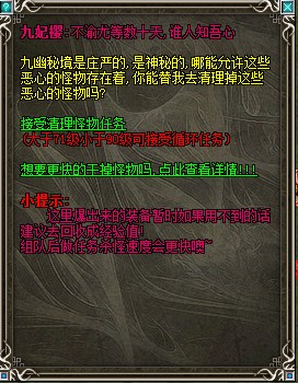 大家进入九幽秘境的地图,都会有对应等级的npc接到杀怪任务,任务会送出丰厚的经验奖励。