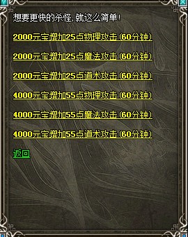 想尽快干掉怪物吗 ,可以使用元宝开启加攻模式,攻击时间将按现实时间计算(开启后就下线一小时,上线后效果消失)。