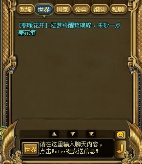 玩家之间的即时聊天工具,分为系统、世界、国家、公会、组队、私聊6个频道。每次发言有一定的时间间隔限制。