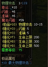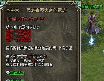 【极品+10】此属性为积分武器的祈灵效果,祈灵在“积分武器NPC处进行”,每次消耗1点综合积分,成功则增加1点极品攻击属性,失败则无效果或减少1点极品属性。成功祈灵到极品属性+10的话,激活此属性,额外增加10-15点攻击。