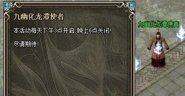 1、活动地图从九幽化龙潭使者处进入(地图内可以进行PK,死亡会掉落装备)