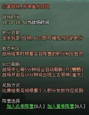 炎帝败给蚩尤后,与黄帝联手再战邪神。要玩《傲视遮天》玩家可自由选择加入炎帝阵营或者黄帝阵营,选择阵营后在比赛结束前将不可以更换其他阵营。每5分钟在阵营中心刷新一只魍魉,战场开始10分钟后 将出现上古邪神蚩尤,掉落全服所有装备(不会掉落神剑和神甲)。
