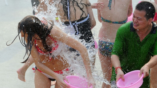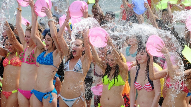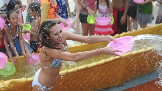 深圳民俗文化村,昨日在新傣寨举办夏日冰爽泼水狂欢节,游客与身穿比基尼泳装的乌克兰美女,在傣寨广场泼水狂欢,场面热闹。