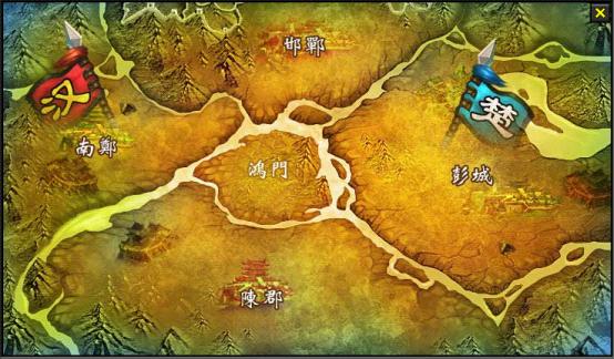 楚汉的世界主要分为五块大地图,其中彭城和南郑是各自主城所在;鸿门为中心交汇处,连接四方;邯郸和陈郡则是中立城市所在。