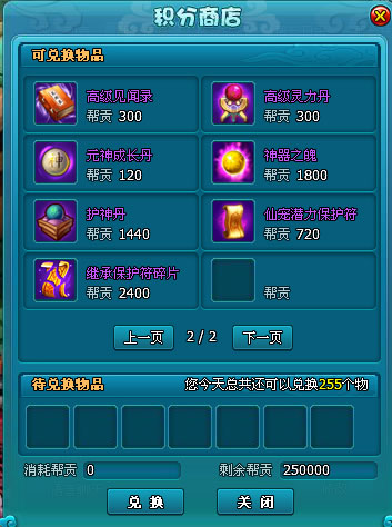 现在帮会贡献不仅仅可以用于领取帮会技能,阅读藏经阁,驯养小宠物,还可以直接在帮贡商店中兑换物品啦!传说中的护神丹,仙宠潜力保护符,继承保护符等珍稀物品都藏在神秘的帮贡商店中,不过只有提升到一定等级的帮会的帮贡商店中才会出现这些珍贵物品哦。